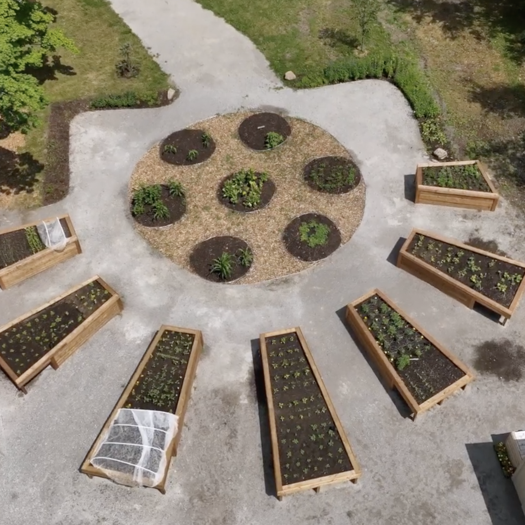 The garden features a central circular design with raised demonstration beds and “grandfather stones,” honouring Indigenous teachings of the circle and the interconnectedness of community. Plantings include the Three Sisters—corn, beans, and squash—alongside seasonal vegetables, fruit-bearing trees and shrubs, and plants with ceremonial or medicinal value. Every element of the design is intentional, reflecting Indigenous storytelling, history, and ceremony.